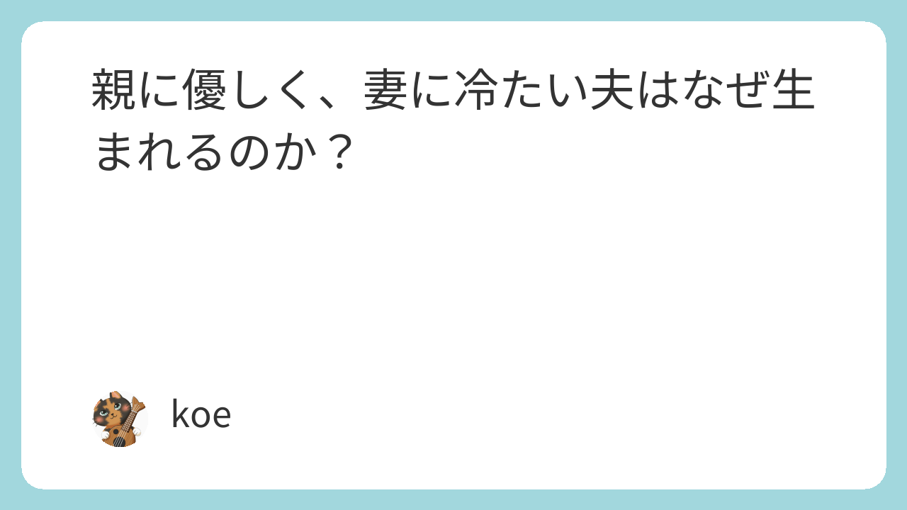 夫婦・家族 親に優しく、妻に冷たい夫はなぜ生まれるのか? 親を大切にする夫がなぜ妻に冷たいのか?その根底にある「愛の混同」と「承認欲求のズレ」を考察。孤独な痛みに直面した配偶者が心の平安を守り抜く「最終防御」を提案します。 2025.09.13 夫婦・家族