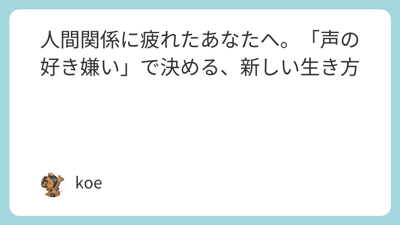 考察 人間関係に疲れたあなたへ。「声の好き嫌い」で決める、新しい生き方 人間関係に疲れたなら、「声の好き嫌い」で付き合う人を選んでみませんか?理屈を超えた心の声に耳を傾け、本当に心地よい関係を築く方法を提案します。 2025.09.15 考察