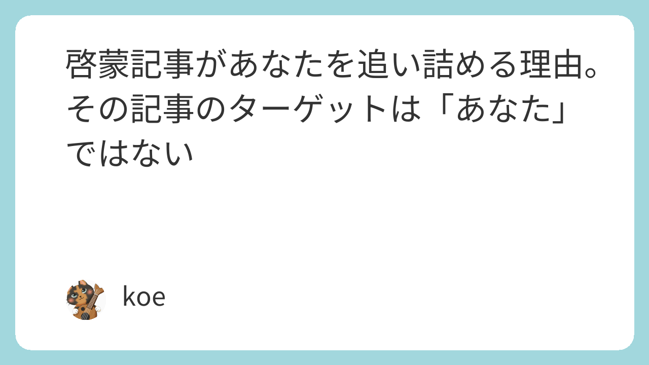 内面・心理 啓蒙記事があなたを追い詰める理由。その記事のターゲットは「あなた」ではない 啓蒙記事の裏側をライターの告白という形で暴く。誇張表現の正体を明かし、あなたが持つ価値を再認識し、「あなたはもう十分に素晴らしい」という心の解放を促します。 2025.09.21 内面・心理