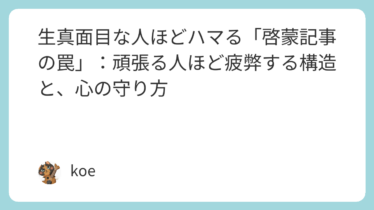内面・心理 生真面目な人ほどハマる「啓蒙記事の罠」:頑張る人ほど疲弊する構造と、心の守り方 「もっと頑張らねば」と自分を追い詰めるあなたへ。その焦りは、啓蒙記事の「誇張」というトリックにハマっているだけかもしれません。生真面目な人ほど陥る心の罠を分析し、既に持っている「あなたの価値」で心を守る方法を伝えます。 2025.09.21 内面・心理