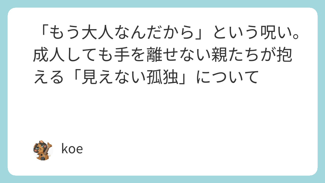 もし今、あなたがいつまで親を続ければいいのだろうという孤独を感じているなら、伝えたいことがあります。
